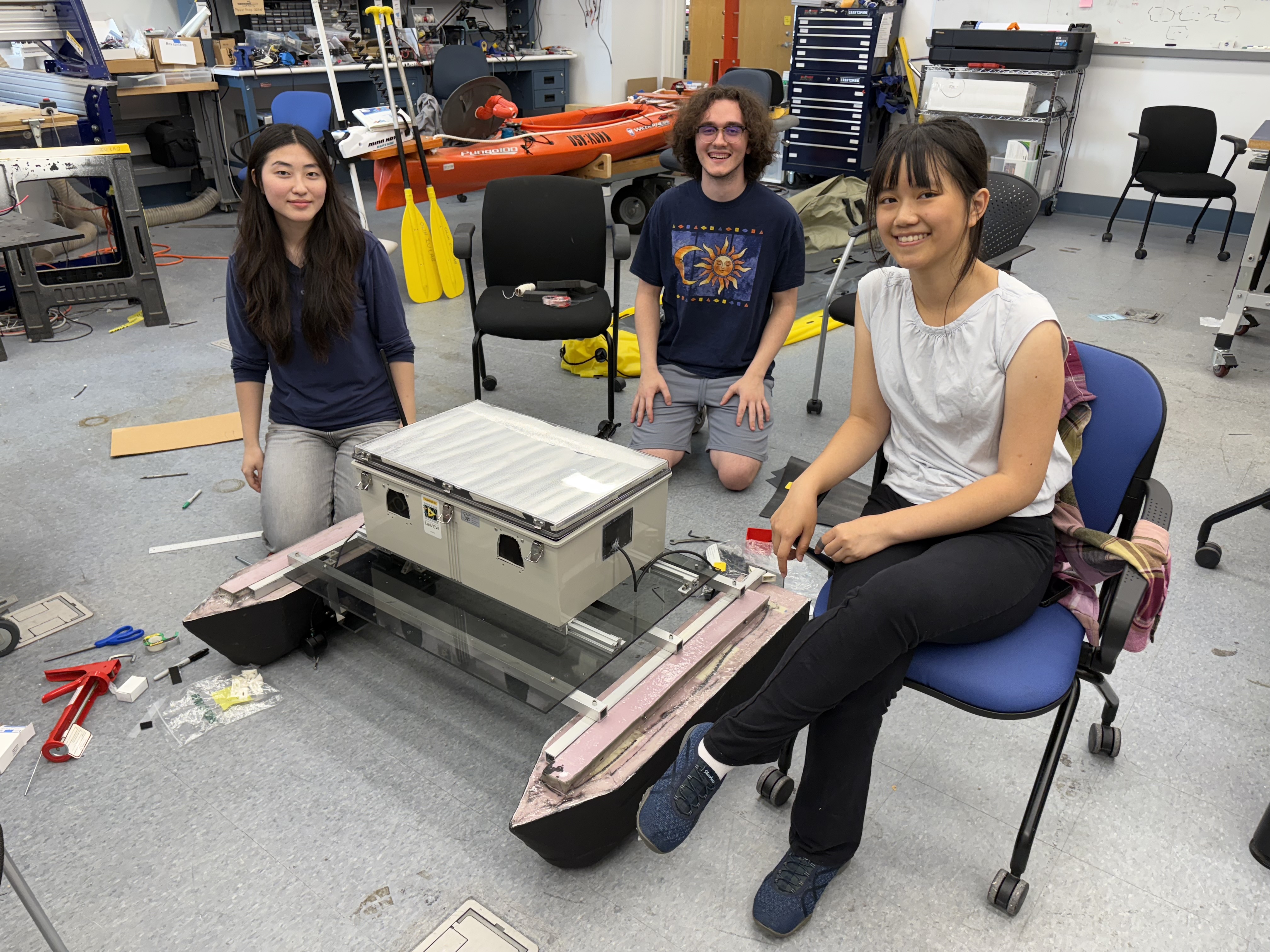 Three student researchers from the Climate Robotics and Expeditionary Science Technology (CREST) Lab at Olin pose with the group's small-scale autonomous surface vessel.