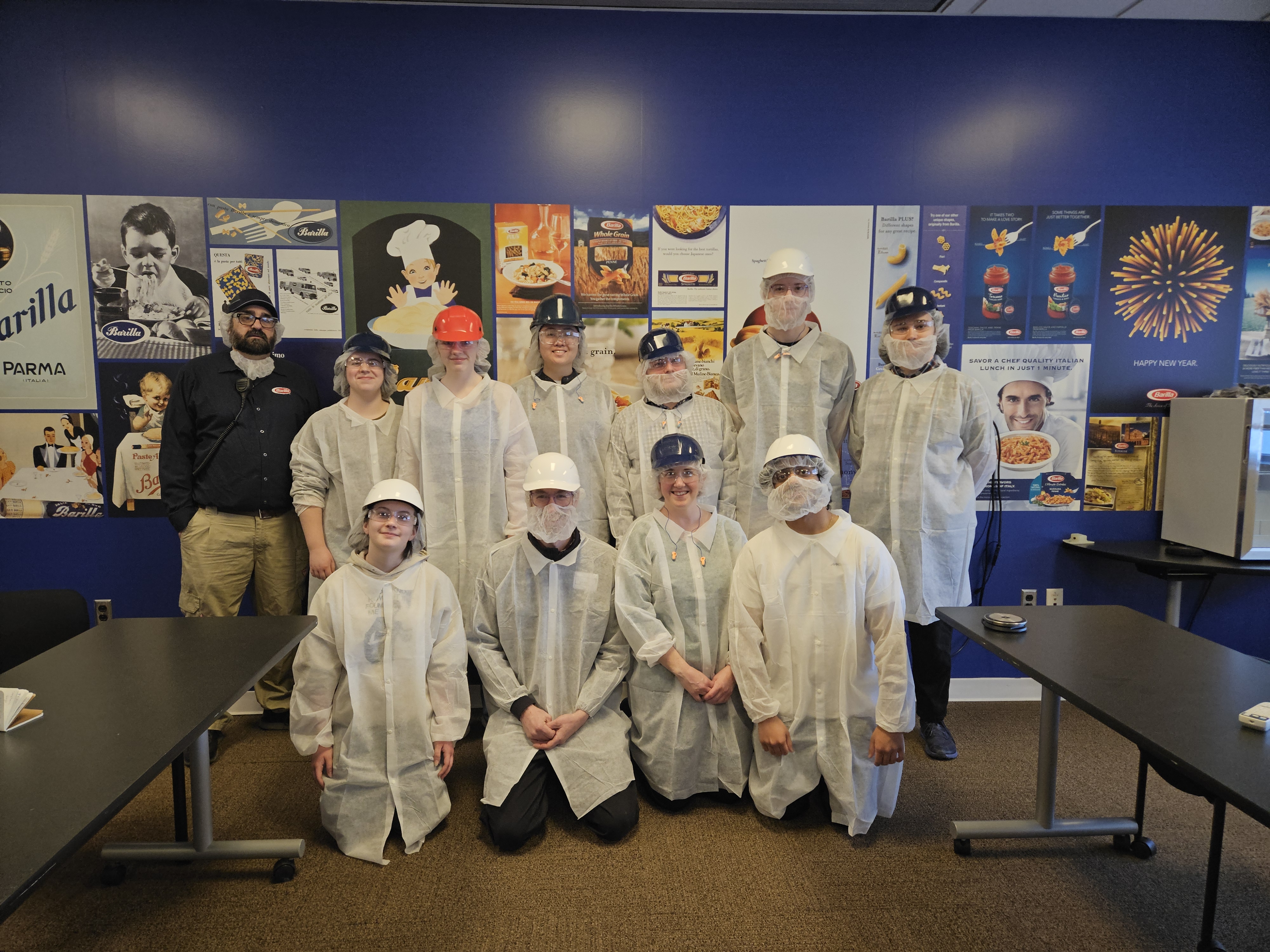 Coby Unger's "How It's Made IRL" co-curricular students and staff pose in one of the offices at the Barilla facility.