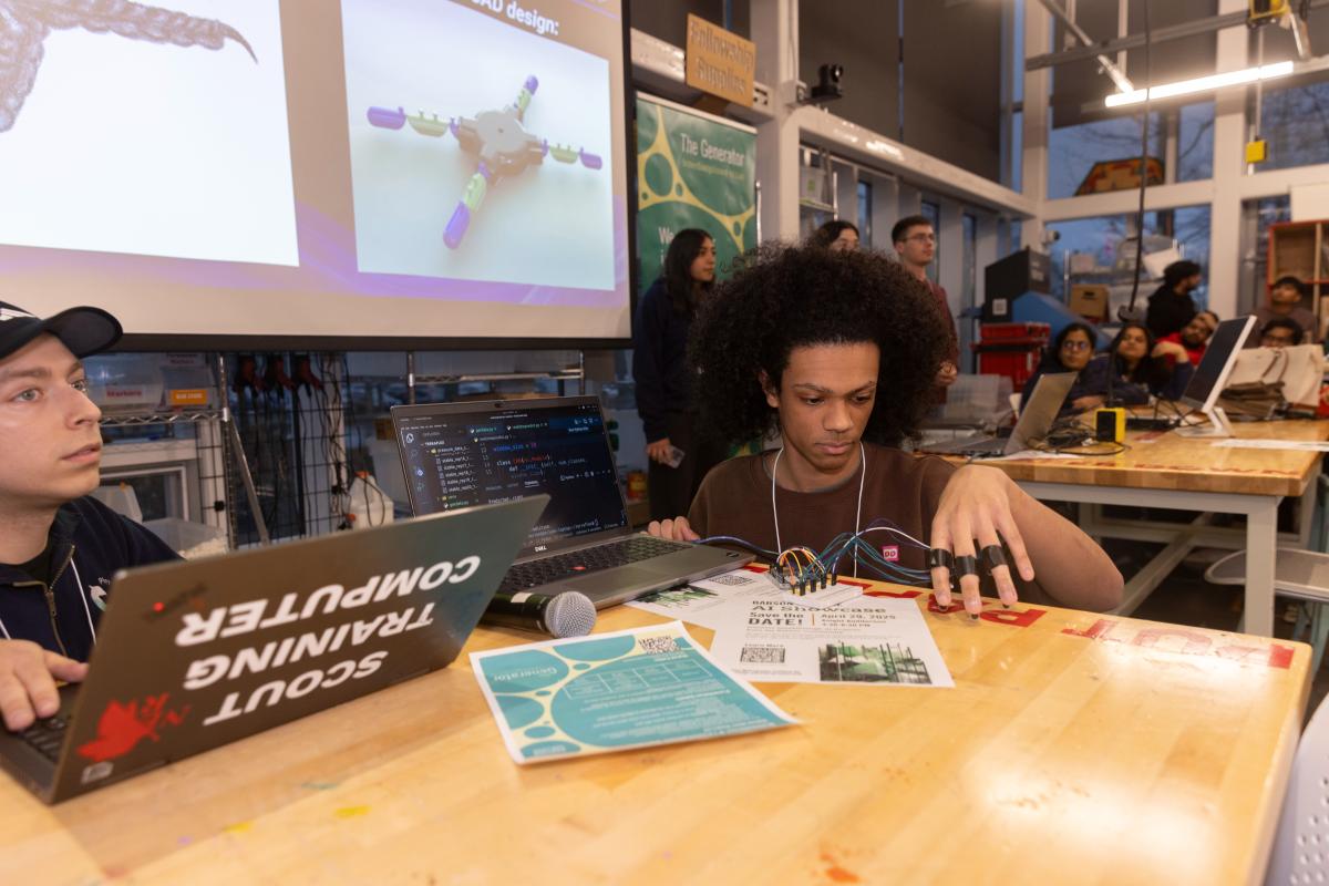 Darian Jimenez '27 is wearing pressure sensors collecting data on different balance states (forward leaning, backwards, stable, etc.), while working on the team's 1st place-winning Terraflex prototype at the 2025 Generator Buildathon.
